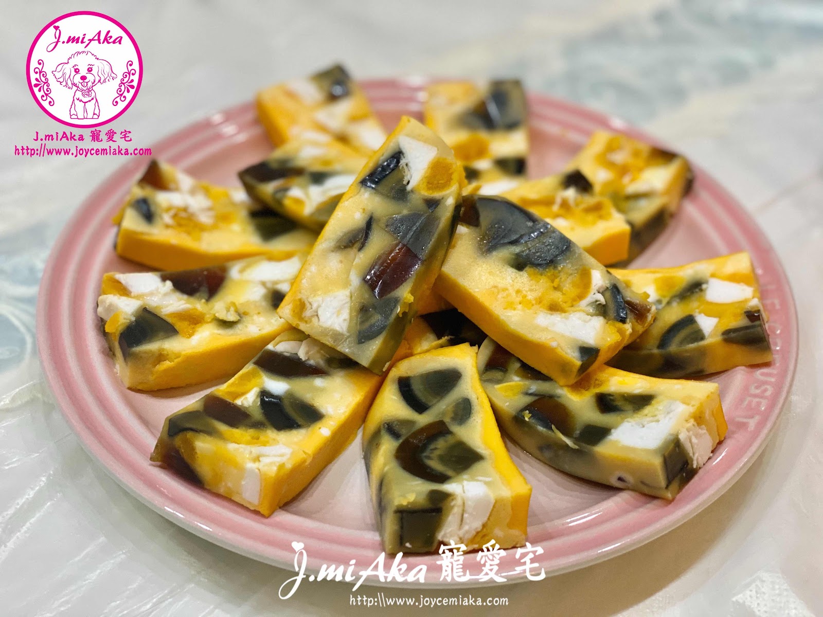- 倒入淨蛋黃液在面,並用牙籤再蛋面拮多個小孔(要插至蛋白質層),轉中火隔水蒸(或蒸焗爐105度)蒸15分鐘至蛋面完全凝固,待稍即可取,切件便可食用。