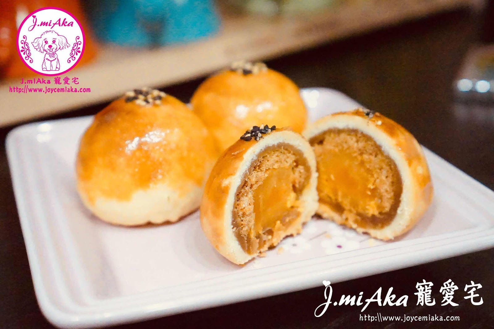 3. 鹹蛋去殼,把鹹蛋黃放在碗內,加入玫瑰露酒浸15分鐘,令蛋白和蛋黃分離;把鹹蛋黃放在鋪了烘焙紙的烘盤上;預熱焗爐,放入中層以150度焗10分鐘,取出放涼;