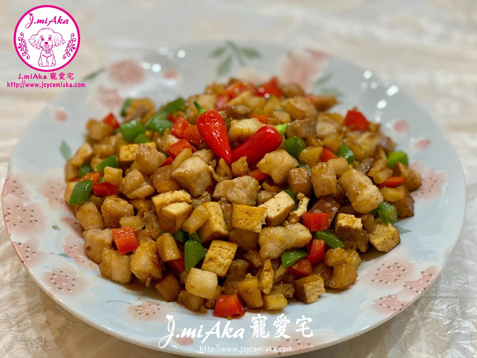 - 再加入豬肉粒、青紅椒及辣椒炒勻,即可上碟。