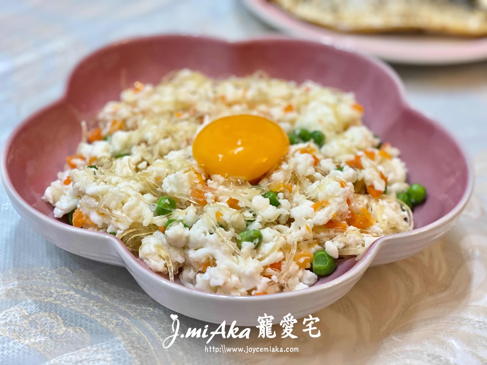 - 熱鑊下3湯匙油,中火放入青豆、甘荀絲、素翅及一茶匙香菇粉用炒,轉慢火倒入(3)蛋白湯,用鑊剷輕輕由外至內不停翻(約3-4分鐘,如圖見水份收乾九成),蛋白凝固,即可上碟,最後在中央可加入生蛋黃做裝飾作點綴(唔用蛋黃也可)。