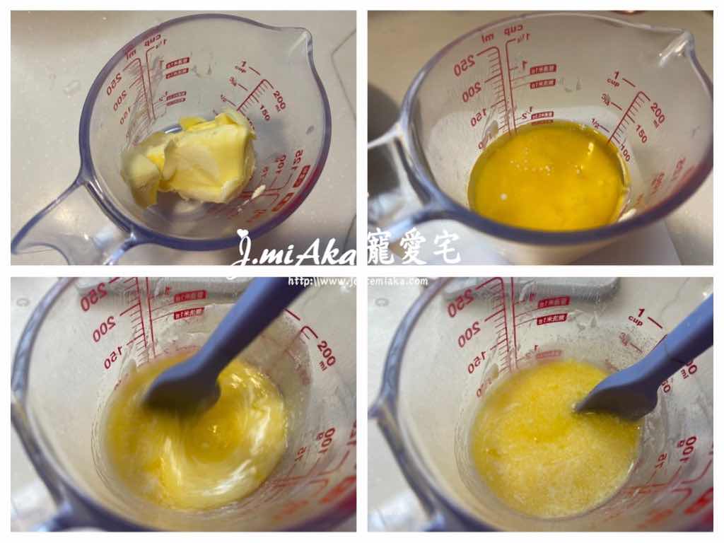 1. 牛油和鮮奶用熱水座溶或叮溶,放涼備用;