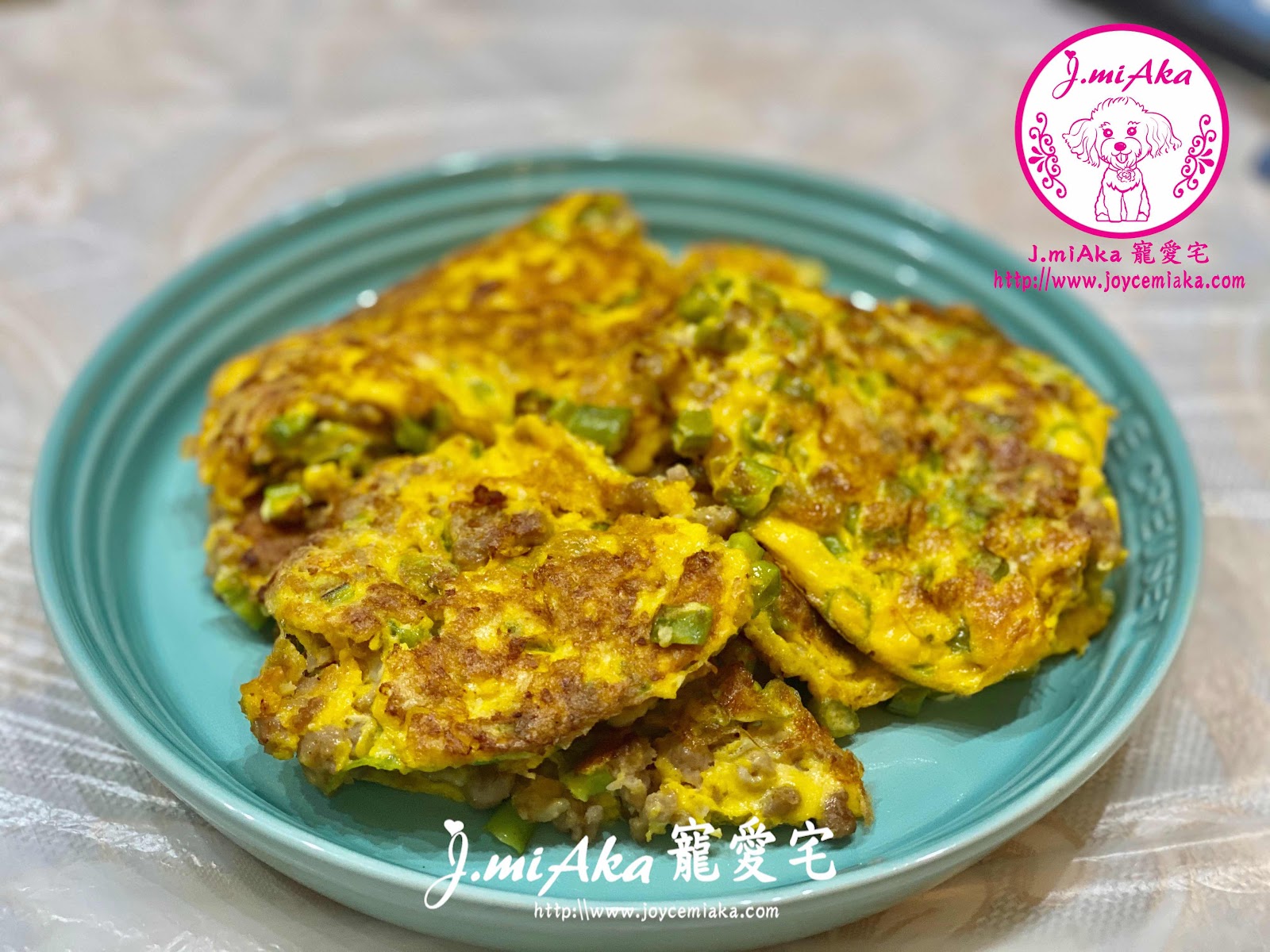 - 熱鑊下1-2湯匙油,中火放入免治豬肉略煎,肉色開始轉變後用鑊鏟炒碎至九成熟,轉中小火倒入(3)豆角蛋液,先用木筷子或鑊鏟快速混和,以中小火煎3至5分鐘,在用鑊鏟畀開4-6份,反轉煎多3-5分鐘至金黃即成。