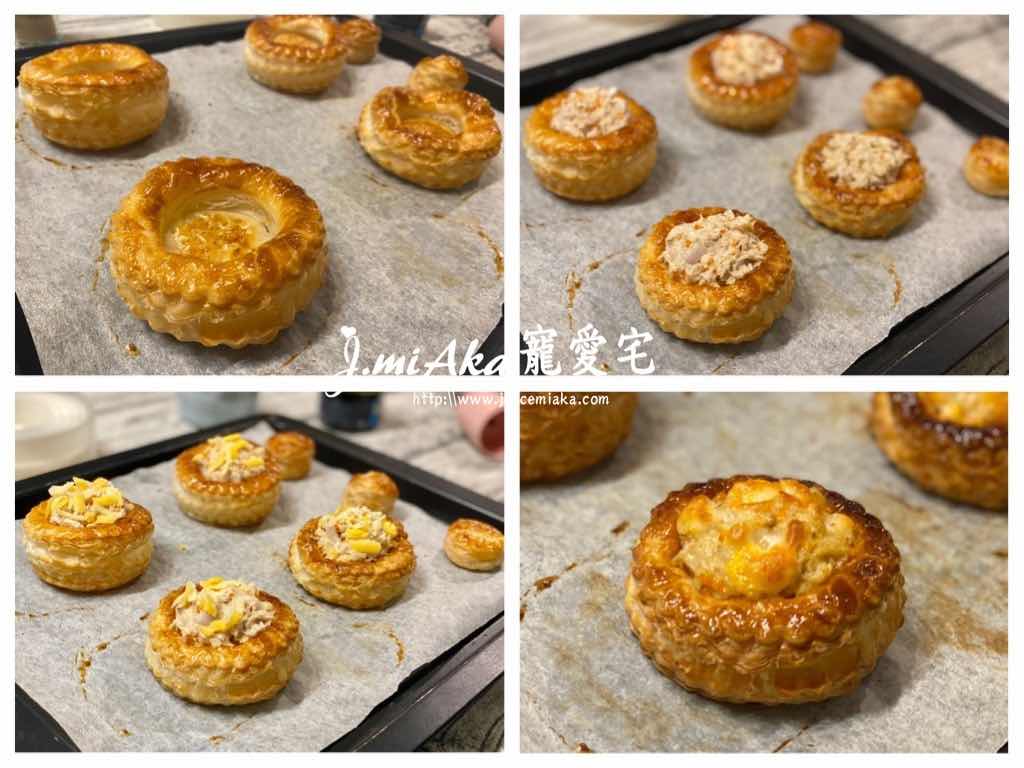 - 先焗酥皮:把即用酥皮鋪在烘焙紙上,用叉感其他刺孔工具拮出均勻小孔;