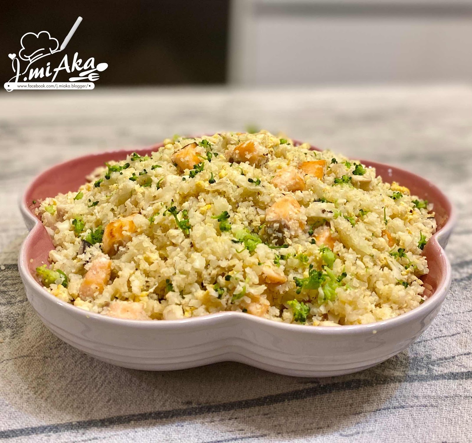 - 最後加入三文魚和西蘭花碎拌勻即可上碟。